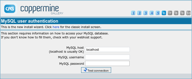 | This section requires information on how to access your MySQL database. If you don't know how to fill them, check with your webhost support. | ||